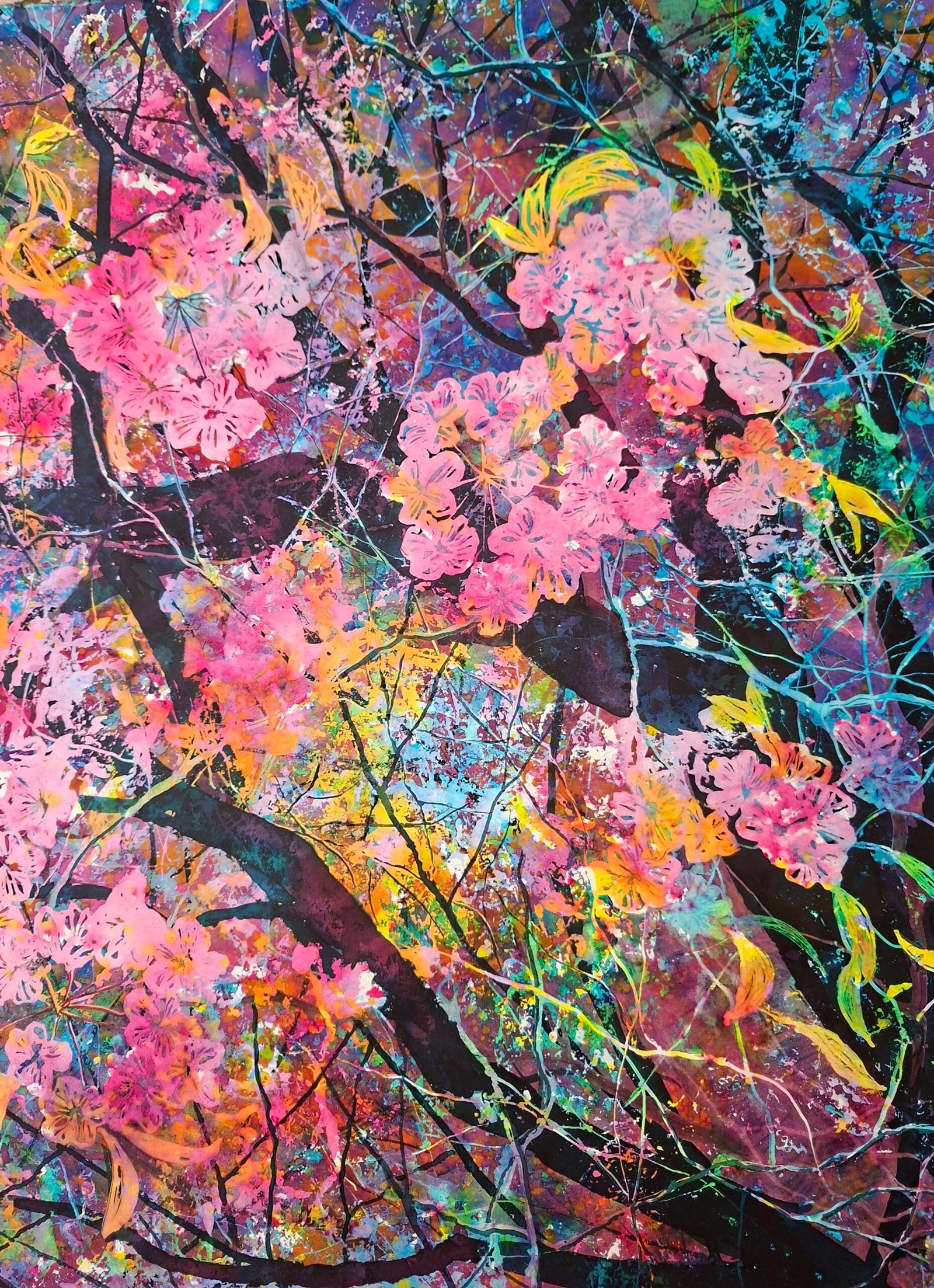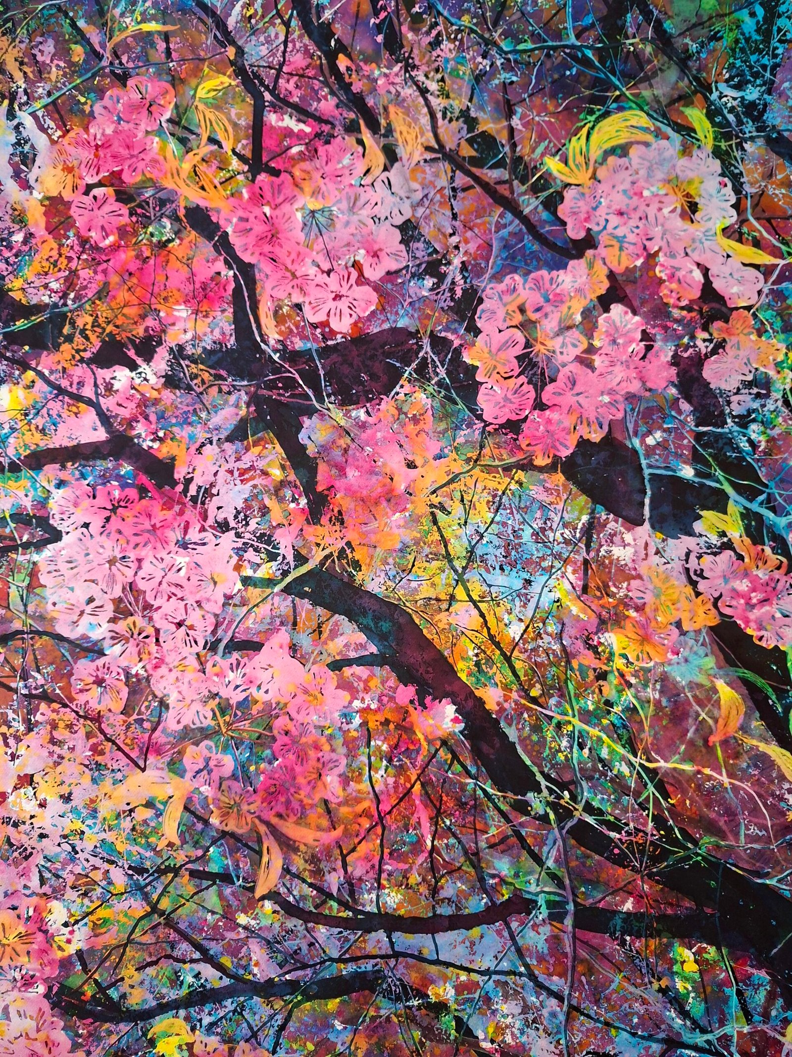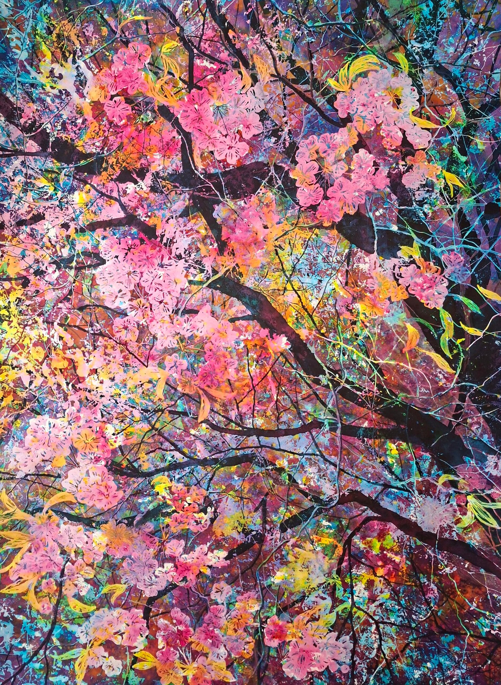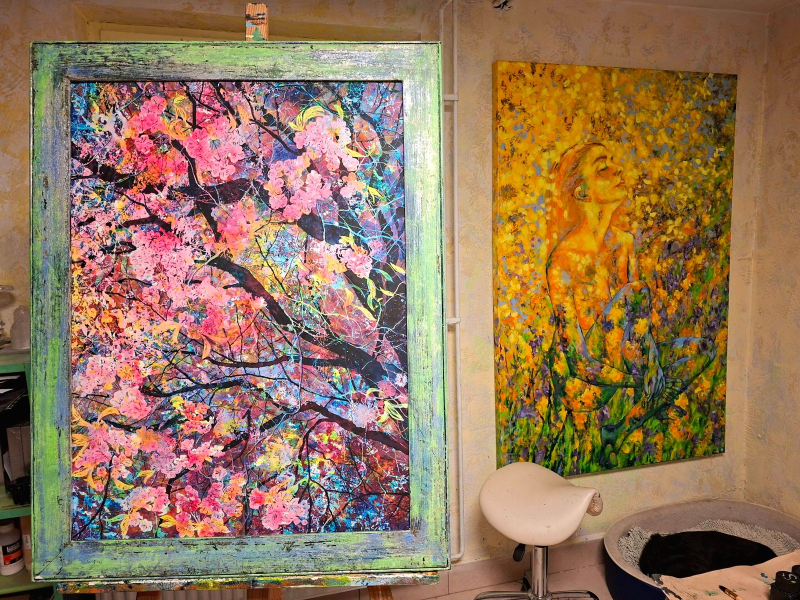 “Kissed by the Sun” was born out of a longing for the sun, light, and spring. This winter was particularly harsh. There were very few of those crystal-clear days with snow and sunshine. It was as if even the weather reflected the darkness that had spread across the entire world. Through painting and creating, I transform this energy and bring light into the space. Due to the layering of paint and mask, its image revealed itself to me only at the very end. This time, it was a cherry tree in bloom, filled with fairy-like energy. Full of love, joy, and lightness. Healing for today’s times.