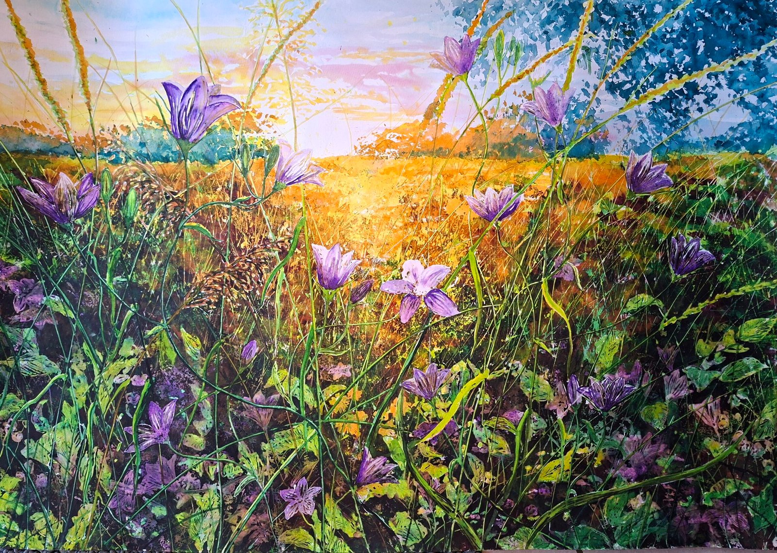 In this painting, I wanted to capture the glow and warmth of the Autumn sun, reflecting off the playful meadow flowers and grasses. It’s my way of saving a piece of sunshine for days without it.