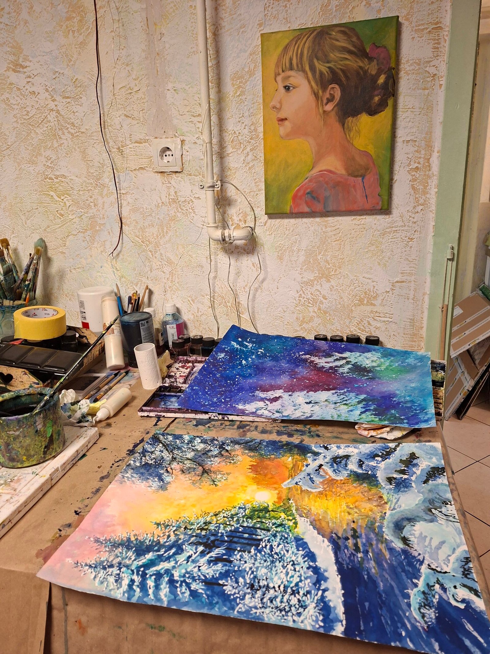 Painting is framed in silver frame.